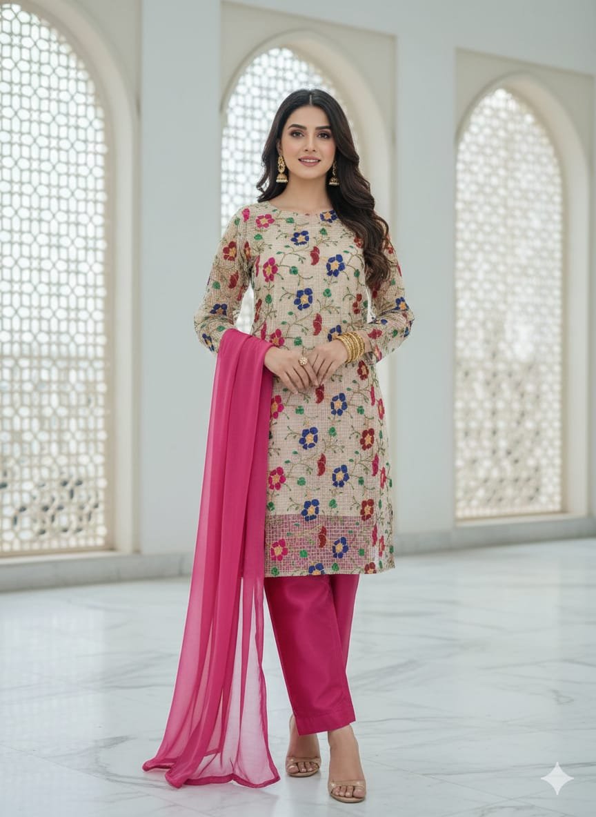 Step into sophistication with Kirmani’s Fashion’s premium embroidered organza suit. This stunning 3-piece ensemble is thoughtfully designed for women who appreciate a perfect fusion of timeless grace and modern fashion. Whether it’s a festive event or a special occasion, this outfit speaks volumes about your refined style.